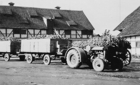 Man sieht den 38er Hannomag, einer der wichtigsten schweren Schlepper auf großen Ackerbaubetrieben Ende der Dreißiger Jahre. Die beiden Vollgummibereiften Anhänger sind mit Zuckerrüben beladen. Dahinter ein Pferdewagen mit Rübenblätter für die Milchkühe.