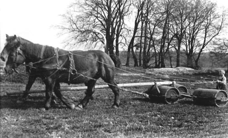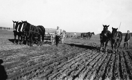 1934Vorne links: Ein 3 Pferde-Gespann mit einer 3 Meter breiten Sämaschine. Vorne rechts : Gespann mit 2 Pferden eggt die Saatrillen zu, damit das Saatgut mit Erde bedeckt wird. Im Hintergrund : Wird mit 3 PS Dünger gestreut.