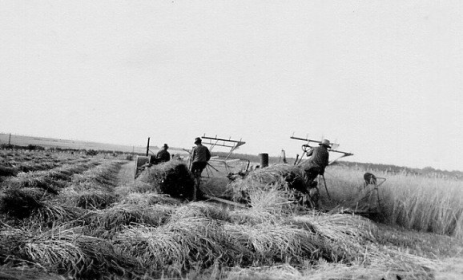 Ein 38 PS Hannomag - Ackerschlepper zieht zwei hintereinandergehängte Selbstbinder (Mähbinder) mit je 6 Fuß Arbeitsbreite und Bodenantrieb. Der Roggen wird hier abgeschnitten und zu Garben zusammengebunden auf dem Feld abgelegt.