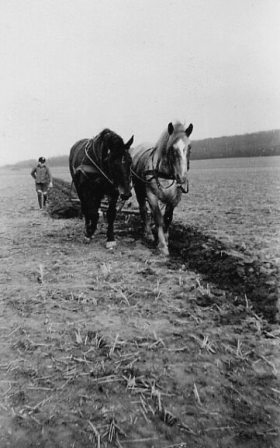 1934Pflügen mit dem Pferdegespann. Die erste Furche wird auseinandergeschlagen .